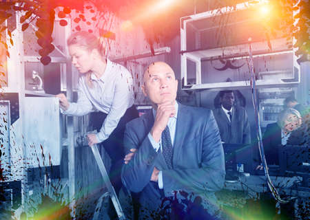 Embarrassed thinking man in escape room