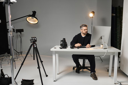 A dedicated person works hard at a desk amid photography gear and studio lights.