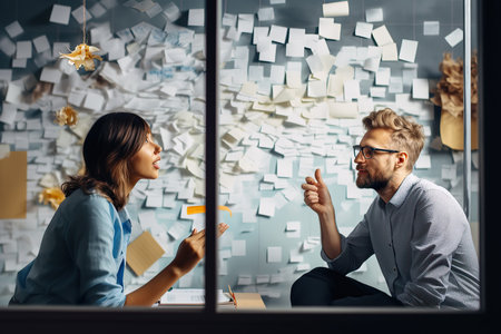 A collaborative team discussion analyzing ideas on sticky notes in creative workspace