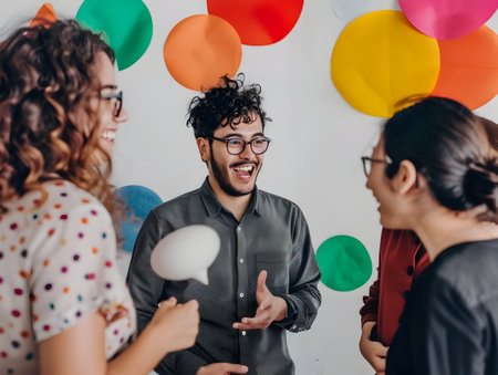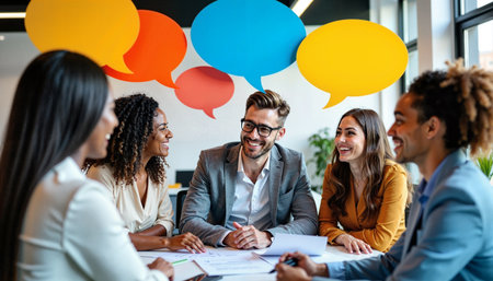 A diverse group of smiling business professionals sit around a table with colorful speech bubbles floating above, representing active communication and collaboration. - Generic AI Image