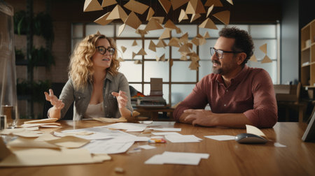 A focused young man and woman engage in a creative brainstorming session, examining materials on a table in a modern workspace. Their expressions reflect concentration and teamwork, highlighting the synergy of collaboration in a vibrant, well-lit environment.