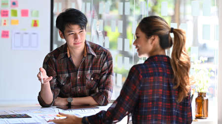 Business man and woman brainstorming with his colleague in an office, talking at office meeting. Busy diverse professional workers