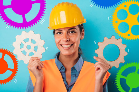 Woman with helmet join pieces of gears as concept of partnership and integration