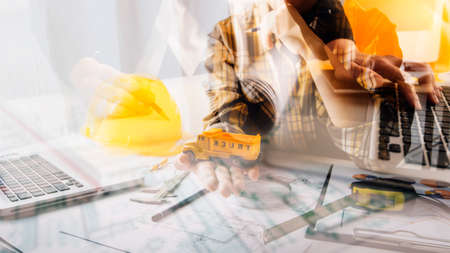 business hand working and laptop with on on architectural project at construction site at office desk in office