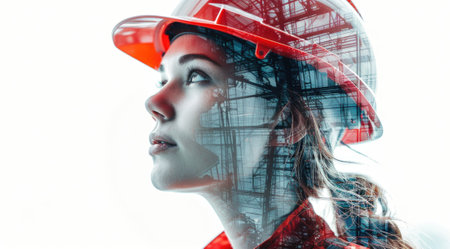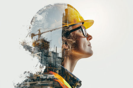 A woman in a hard hat stands confidently, her silhouette blending with a city skyline. Construction cranes and buildings reflect her focus and dedication to the job..
