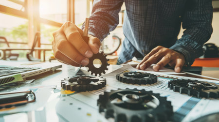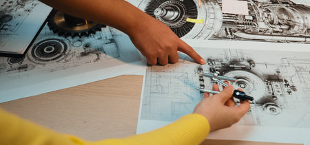 This image showcases hands engaged in creating mechanical drawings, featuring technical tools and gears in a professional workspace, emphasizing precision and creativity. SACTR