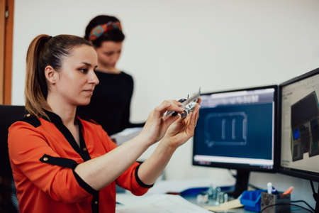 Within the heavy industry, a factory industrial engineer measures with a caliper and on a personal computer Designs a 3D model