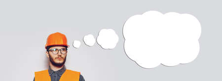 Studio portrait of young construction worker in wearing safety equipment looking away on blank speech bubble. Panoramic banner view. Copy space concept.