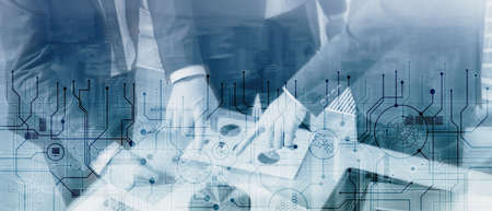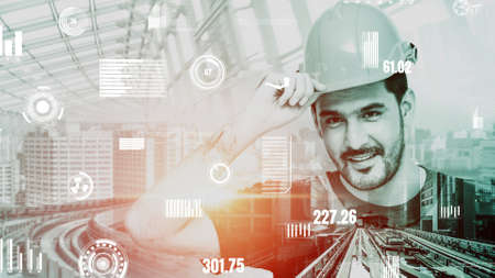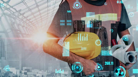 Future building construction and inventive engineering project concept with HUD hologram graphic design. Building engineer, architect people or construction worker works with modern civil technology.