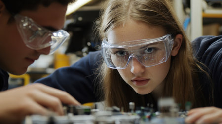 Young engineers collaborating on circuit board project