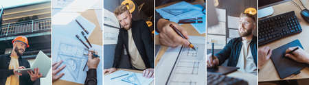 Collage of portraits of bearded man, builder, designer or architect with professional equipment during working day. Concept of occupation, job, motivation