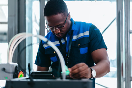 Engineer examines freshly printed 3D component in a workshop , showcasing advanced manufacturing and prototyping technology. Reflecting innovation, precision engineering, industrial design processes