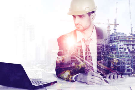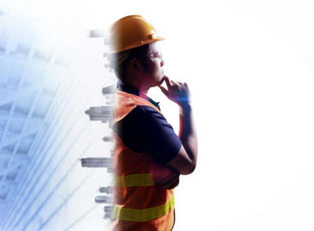 Double exposure of engineer and construction site over white background. Mixed media