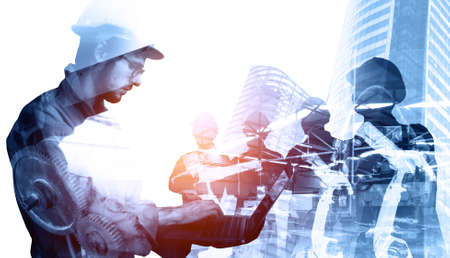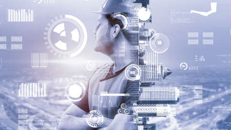 Double exposure image of man engineer overlay with building architecture cityscape. creation city concept.