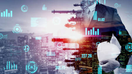 Future factory plant and inventive energy industry concept in creative graphic design. Oil, gas and petrochemical refinery factory with hologram showing next generation of power and energy business.