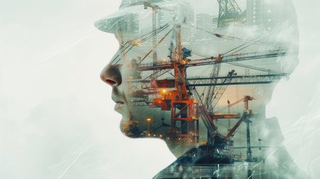 A construction worker's profile interwoven with a vibrant city skyline, symbolizing the fusion of industry and innovation in a bustling urban environment.