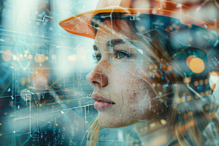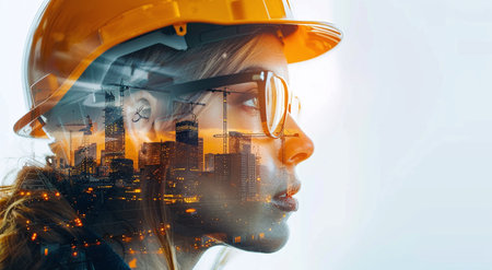Double exposure of a female engineer with a hard hat superimposed on a city skyline, symbolizing urban development and construction.