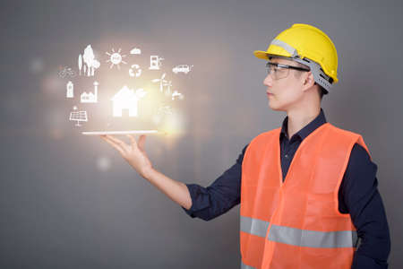 Engineer man is holding digital engineering plan with ecological data, modern city technology concept