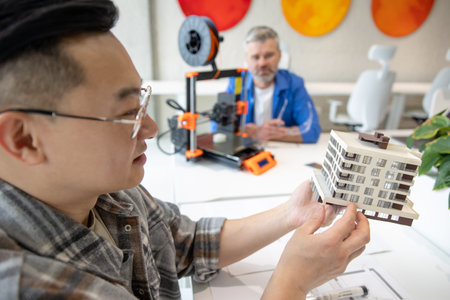 Architects making house model working with 3D printer, creating process.