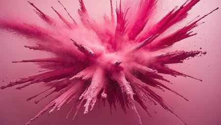 Abstract burst of vibrant pink powder captured mid-explosion against a gradient pink background. The dynamic composition conveys energy, motion, and creativity.