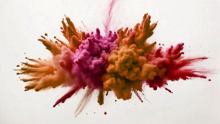 Realistic abstract explosion of vibrant pink and yellow holi powders on matte black surface, festival celebration concept