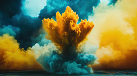 A striking visual of an explosion of colorful smoke and dust in blue and yellow, creating a captivating abstract pattern filled with dynamic energy.