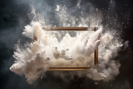 Generative AI, White powder splash and smoke around empty vintage beautiful frame.