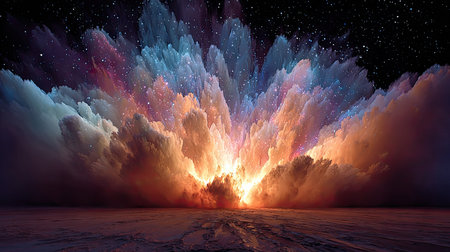 An artistic rendering features a vibrant explosion of layered clouds in shades of blue, orange, and purple. The dramatic lighting emanates from the center. This composition suggests a dynamic, surreal environment. The image is suitable for various creative applications and graphic design projects.