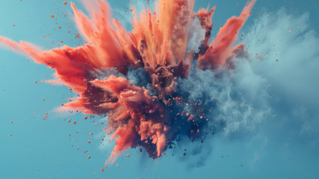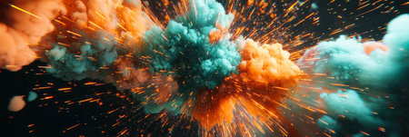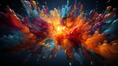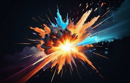 An abstract digital illustration showcases an explosion of colors against a dark backdrop. The composition features a burst of orange, blue, and white hues. The image has a textured quality and dynamic lighting, suggesting an energy-filled concept. Suitable for various creative projects, including editorial and commercial use.