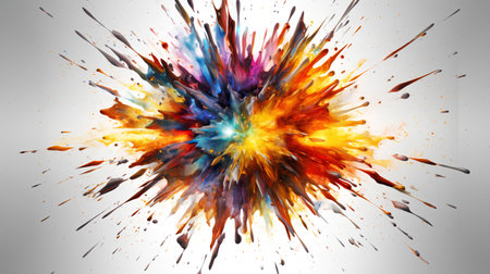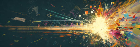 A brilliant explosion of color and geometric shapes bursts from a central point, symbolizing a moment of pure creation and innovation. This dynamic and energetic visual represents the big bang of a new idea, the speed of technology, or a vibrant celebration of success.