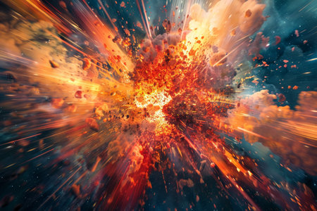 A vibrant explosion captures the chaos of energy and light, showcasing bright flames and colorful shards flying in all directions, creating a dramatic visual impact.