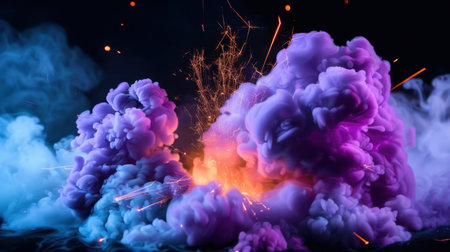 A stunning visual of a colorful smoke explosion featuring vibrant hues of purple and blue with dramatic sparks and light effects. The dark background enhances the ethereal quality, creating a mesmerizing and energetic atmosphere. Perfect for artistic and abstract themes.
