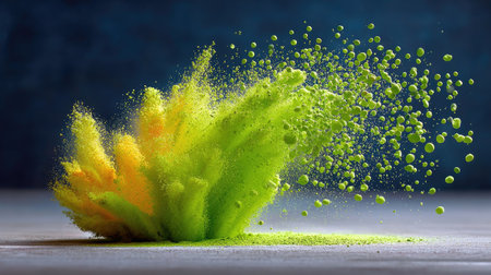 A matcha powder explosion frozen in time, with fine green particles suspended in air against a dark background