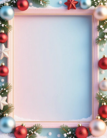 A decorative holiday frame surrounded by red and white ornaments, stars, and greenery, creating a cheerful atmosphere for Christmas and New Year festivities.