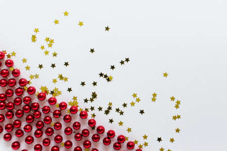 Festive greeting backgound with New Year decorations - red beaded garland wreath and golden stars on white backgound with copy blank space.