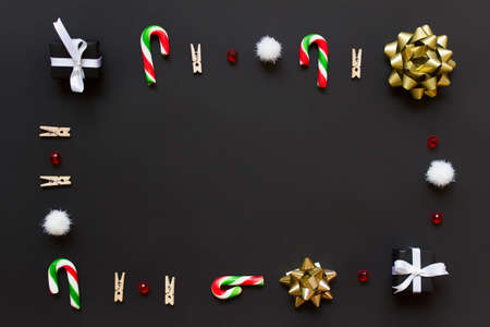 Christmas frame arrangement with wooden pins, candy canes, fluffy white balls, red crystal balls, presents and golden bow on black background. Photo with blank space in the center.