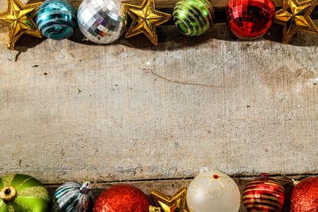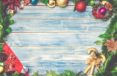 Merry Christmas and Happy new year background concept. Various christmas decoration items on wood background