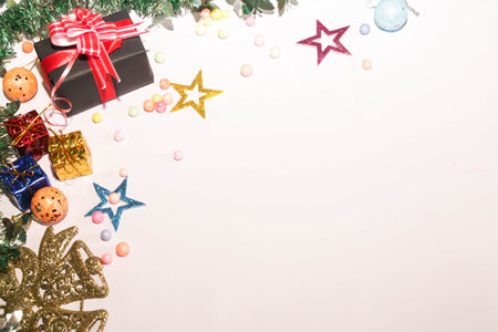 Christmas background with decorations and gift boxes on white background with copy space