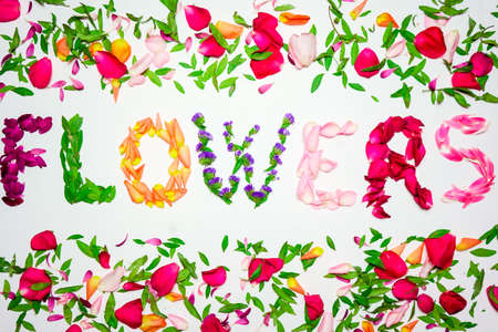 Flowers Written With Pink, Green, Purple and Orange Flowers On A White Background Fill With Flowers