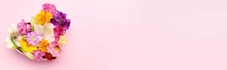 Heart made of beautiful different flowers on light pink background with space for text