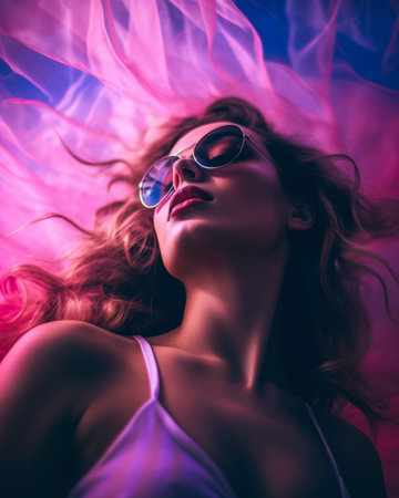 Vibrant portrait of a young woman with bold makeup and neon lighting effects