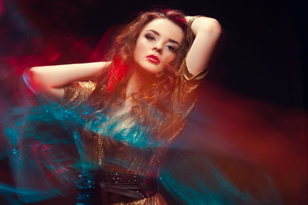 Fashionable Artistic Portrait Of A Beautiful Female Model In Bright Lights. Color gel photography