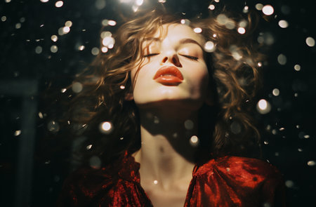 Woman red sequined bodysuit glamorous stage lighting dramatic pose confetti falling celebratory mood