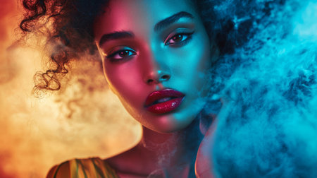 A striking close-up portrait of a woman illuminated by colorful neon lighting and surrounded by a smoky atmosphere, creating a bold and futuristic aesthetic.