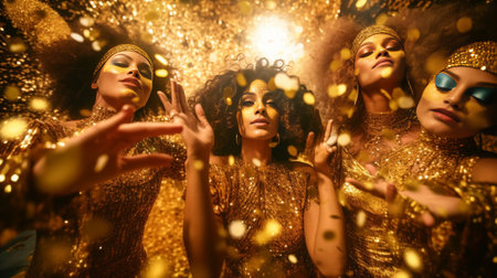 Curly ladies in fashionable dresses with sparkles laugh blow kiss against background of golden confetti : Generative AI