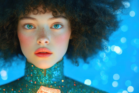 Vibrant Portrait of Young Woman with Curly Hair and Sparkling Blue Background.
