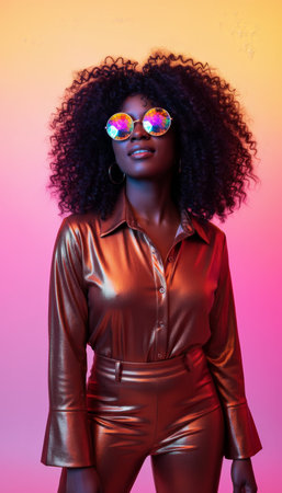 Afro haired woman showcasing vibrant fashion with psychedelic kaleidoscope glasses and a shiny metallic outfit, embodying a retro disco aesthetic with confident style
