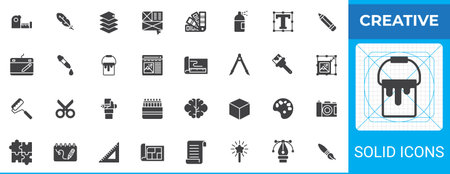 Graphic design solid glyph icon pack. Vector sign collection featuring icons like pen tool, ink dropper, color palette, tablet, paint bucket, layer stack, feather, and webpage layout.