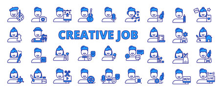 Creative jobs icons in line design blue. Creative jobs, designer, artist, writer, photographer, illustrator, filmmaker on white background vector. Creative jobs editable stroke icons