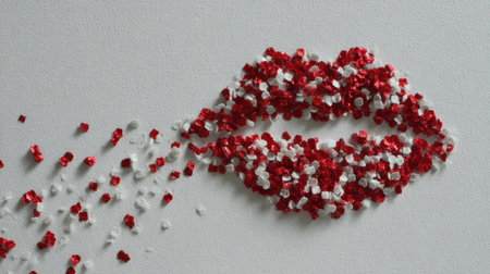 Red and white confetti forms a blown kiss cloud, creating a playful and romantic design on a blank white backdrop for Valentines Day.